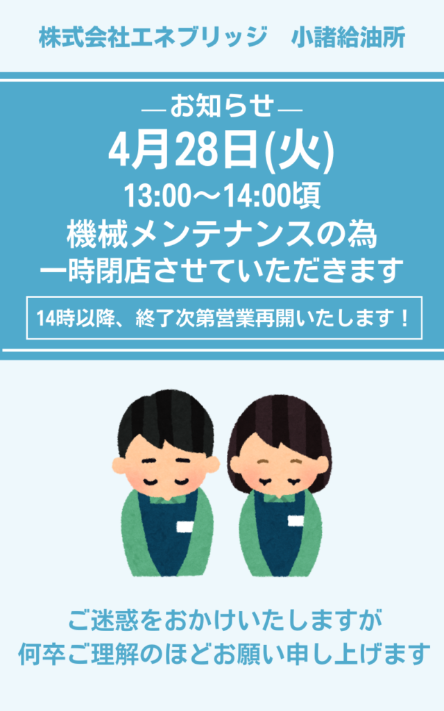 4月28日(火) SS一時閉店のお知らせ(機械メンテナンス)